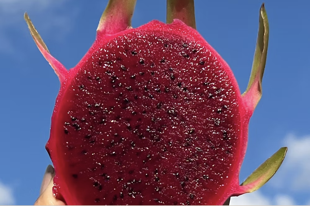 Dragon Fruit has a mildly sweet, refreshing taste—a cross between kiwi and pear—with a soft, creamy texture dotted with tiny edible black seeds. Depending on the variety, the flesh can be white, red, or deep magenta, each with its own subtle flavor nuances.